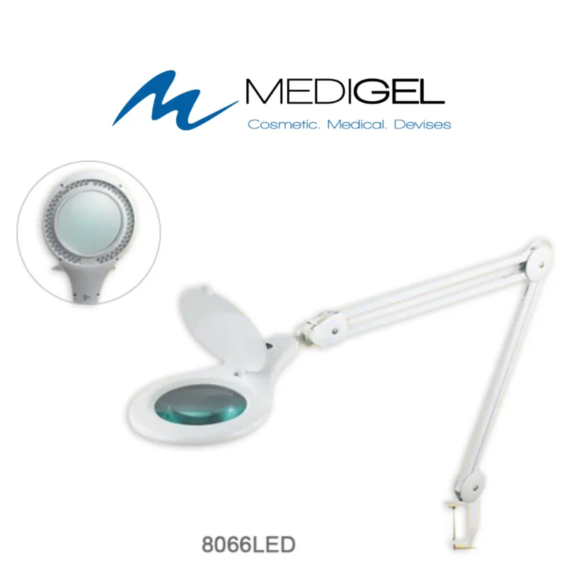 לופה לד LED בעלת 90 נורות לד לבנות בקוטר 5 אינץ מגדילה פי 3 לטיפולי קוסמטיקה המונחת על עגלת הטיפולים (מגיעה גם עם תפס לשולחן)